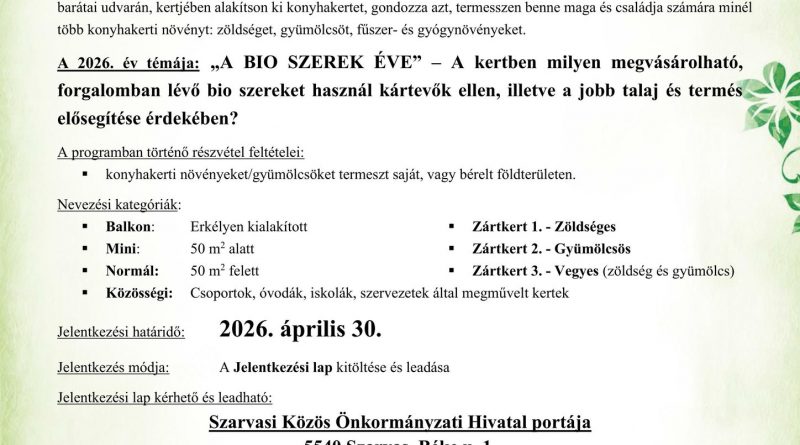Read MoreRádió Szarvas – „A legszebb konyhakertek” – Magyarország legszebb konyhakertjei 2026. év témája _ ” A bio szerek éve” Jelentkezési határidő: