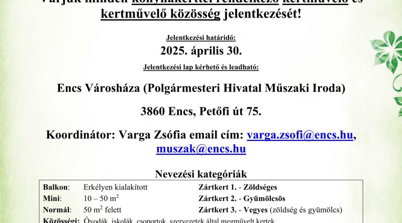Read More„A legszebb konyhakertek” – Magyarország legszebb konyhakertjei Magyar Örökség díjas országos programhoz csatlakozva Encs Város Önkormányzata meghirdeti „A legszebb konyhakertek”