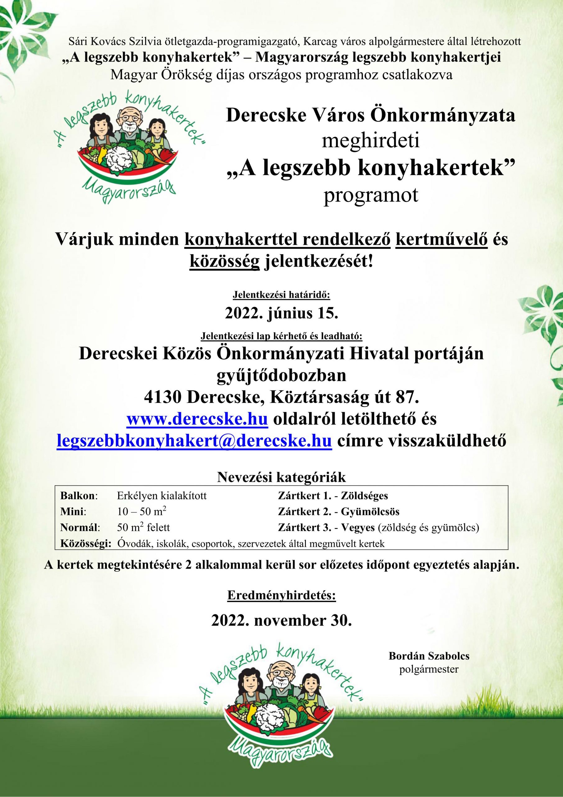 www.derecske.hu oldalról letölthető és legszebbkonyhakert@derecske.hu címre visszaküldhető