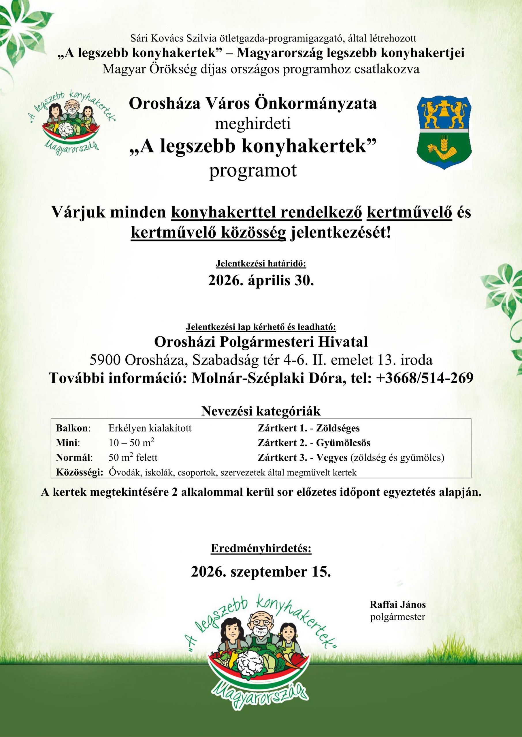 Orosháza Város Önkormányzata ismét meghirdeti „A legszebb konyhakertek” – Magyarország legszebb konyhakertjei című, országos szintű, Magyar Örökség díjas program helyi versenyét. A kezdeményezés célja a kertművelők munkájának elismerése, valamint a lakosság ösztönzése arra, hogy minél többen alakítsanak ki és gondozzanak konyhakerteket saját vagy bérelt földterületen.