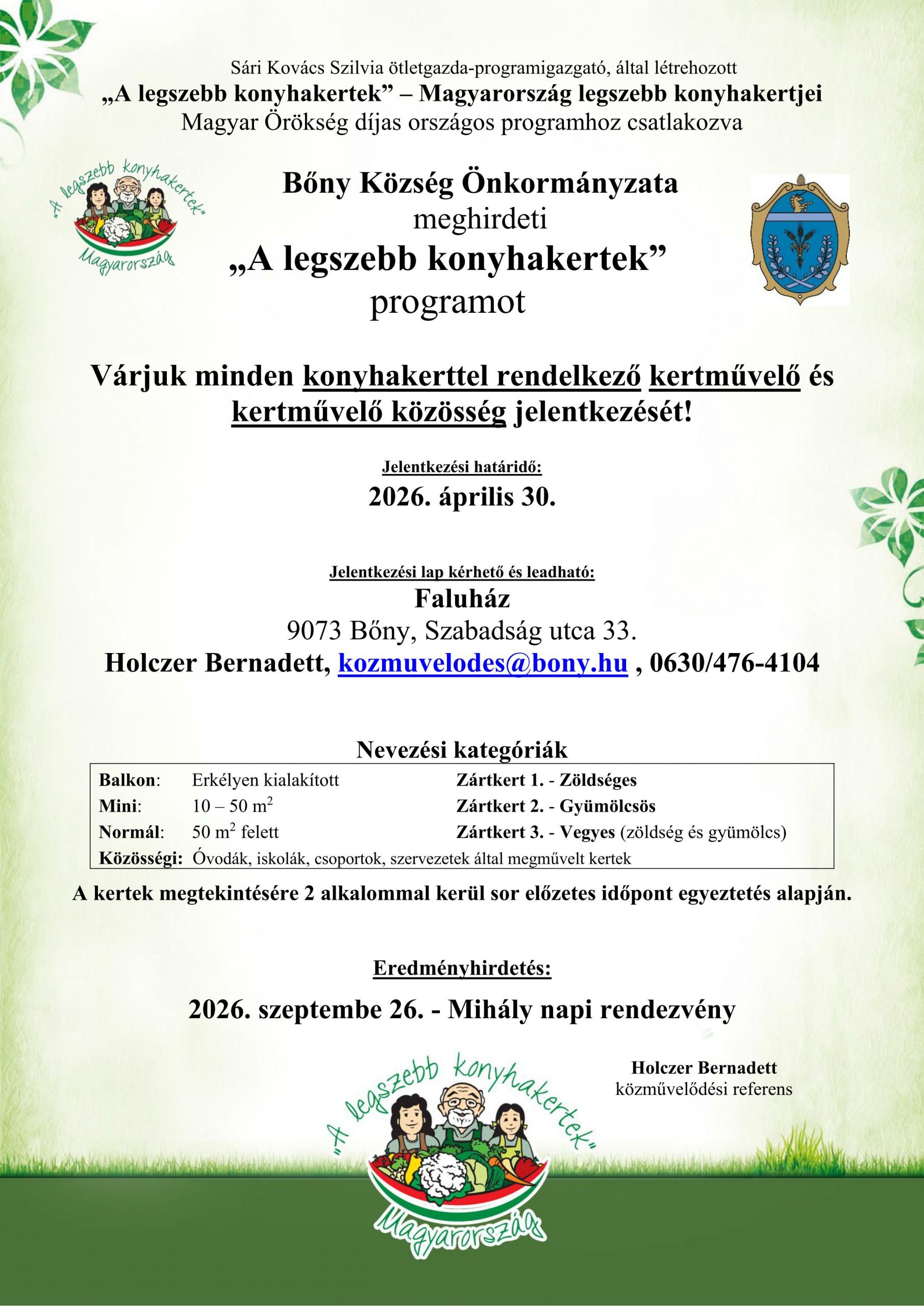 Települési hírek Bőny – Kertnevezés Szokai Szilvia 2026.03.17.2026.03.20. 0 Comments Bőny, Győr-Moson-Sopron megye Forrás: https://www.facebook.com/permalink.php?story_fbid=pfbid0b8d86uk8gtKrPZzcB59Tsy1rWjQfi3Jig5ZN6bvmkuav9oUZ3ozRBKwae85HumDil&id=61566312677190 Legszebb konyhakertek felhívás!