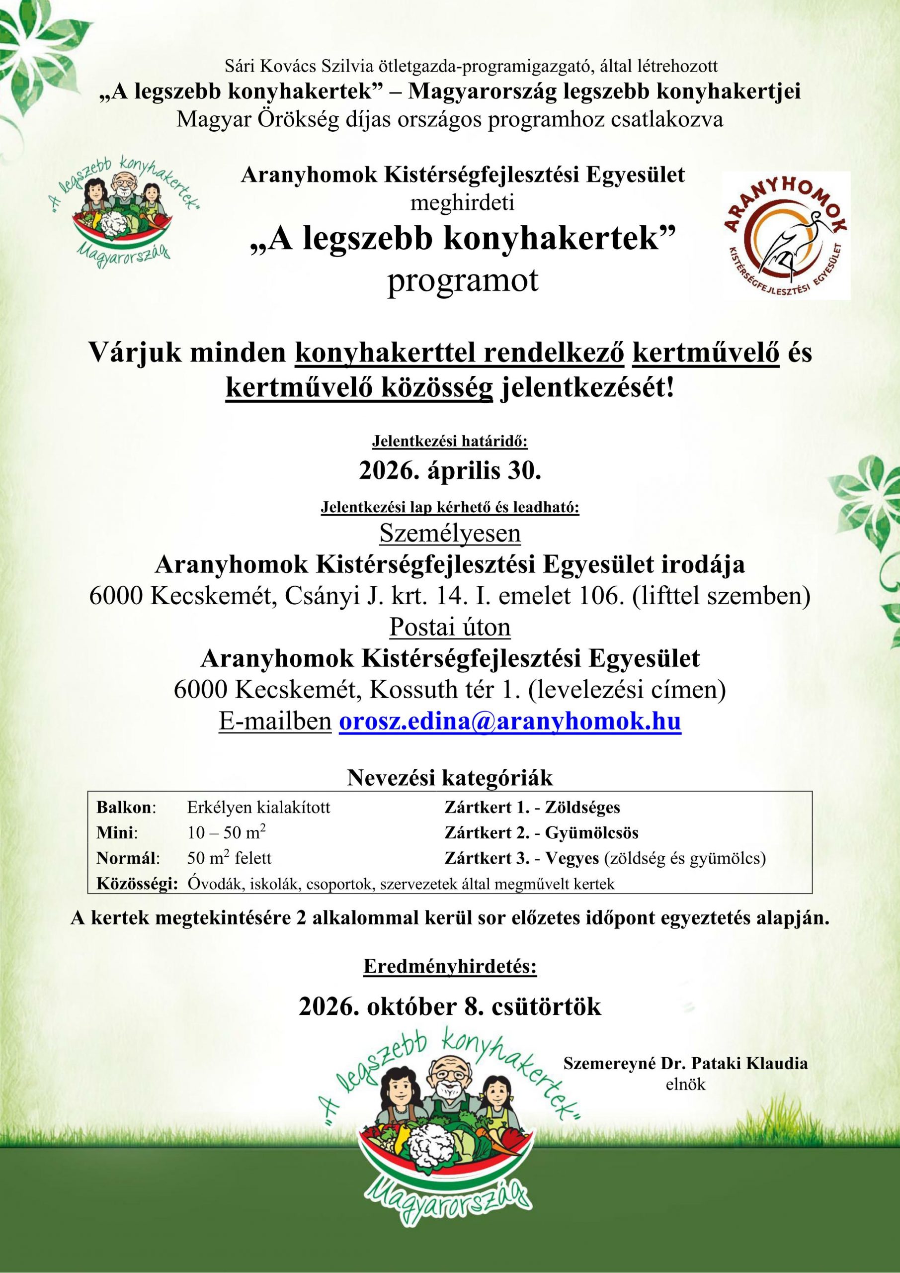Kecskemét városa az Aranyhomok Kistérségfejlesztési Egyesület szervezésében idén 14. alkalommal vesz részt „A legszebb konyhakertek” – Magyarország legszebb konyhakertjei elnevezésű, Magyar Örökség díjas országos programban.