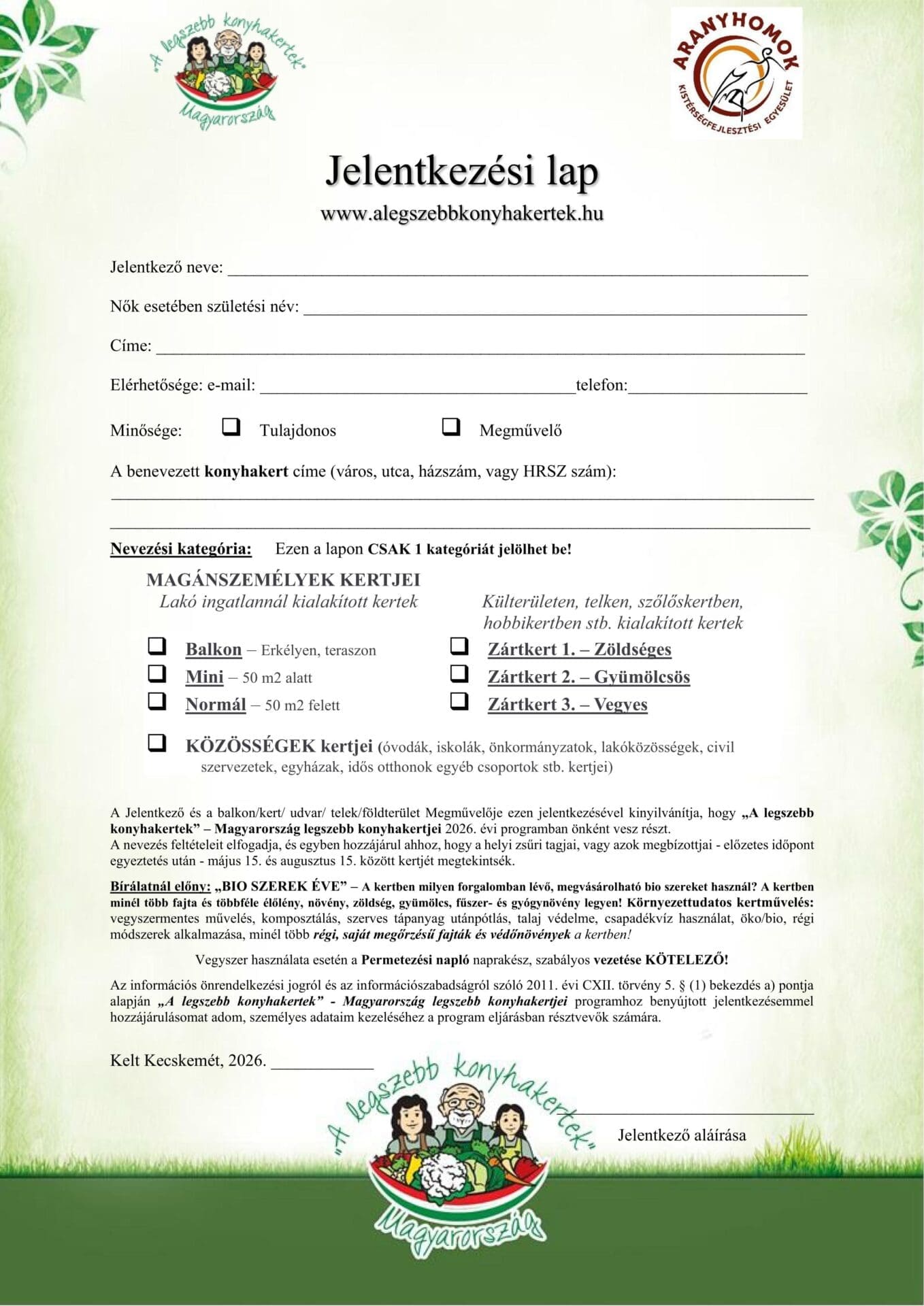A program felhívása és a jelentkezési lap elérhető az Aranyhomok Kistérségfejlesztési Egyesület honlapján, www.aranyhomok.hu. és facebook oldalán, www.facebook.com/akegyesulet.